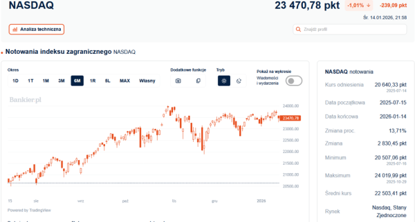 W środę Dow Jones stracił jedynie 0,09% i zakończył sesję na poziomie 49 149,63 punktów. S&P500 obniżył się o 0,53% i skończył z wynikiem 6 926,63 pkt. We wtorek oba indeksy zanotowały nowe rekordy, a S&P500 był bliski przekroczenia bariery 7 000 punktów.