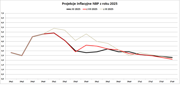 Nawet jednak, gdyby Rada nie zdecydowała się na te cięcia, to najnowsza prognoza inflacyjna zakłada, że inflacja CPI osiągnie docelowy poziom 2,5% dopiero w drugim kwartale 2027 roku i utrzyma się na tym zbliżonym poziomie do końca 2027 roku. Dodajmy, że w całym okresie objętym listopadową projekcją (czyli do końca 2027) bazowa inflacja CPI nie osiąga celu inflacyjnego, spadając do 2,6% w czwartym kwartale 2027 roku (obecnie wynosi ona około 3%).