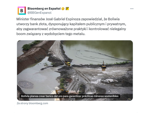 Boliwijski minister finansów i gospodarki José Gabriel Espinoza oznajmił, że nowy rząd planuje ustanowienie Banku Złota z udziałem środków publicznych i prywatnych. Bank Złota będzie wymuszał identyfikowalność metalu, standardy środowiskowe i formalne, w czasie gdy rekordowe ceny kruszcu potęgują nielegalną działalność wydobywczą w kraju.