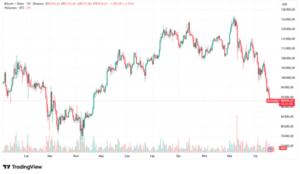 We wtorek, 18 czerwca, ceny bitcoina spadły poniżej progu 90 000 dolarów, nim powróciły do 91 000 dolarów. Najpopularniejsza kryptowaluta nie była tak korzystna cenowo od kwietnia. Spadek sięgał blisko 30% od rekordowej wartości 126 000 dolarów, osiągniętej przez bitcoina 6 października.