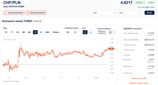 W środowy poranek kurs franka szwajcarskiego kształtował sięna poziomie 4,6217 zł. Dzień wcześniej na rynku franka doszło do nieznacznejgorączki zakupów, czego rezultatem był kurs CHF/PLN sięgający chwilami 4,6371zł. Była to najwyższa wycena helweckiej waluty od kwietnia 2025 roku.