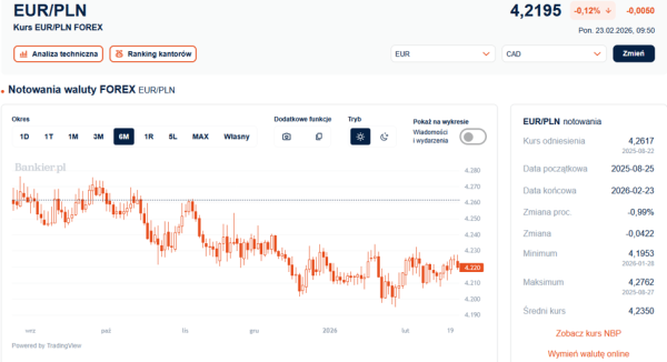 W tym samym czasie, w poniedziałek o 9:50, kurs eurokształtował się na poziomie 4,2195 zł, wykazując spadek o 0,5 grosza w stosunku do stanu sprzed weekendu. Taka sytuacja wskazuje na kontynuację lokalnego trendu bocznego, obowiązującego od początku roku, w przedziale 4,1950-4,2350 zł.
