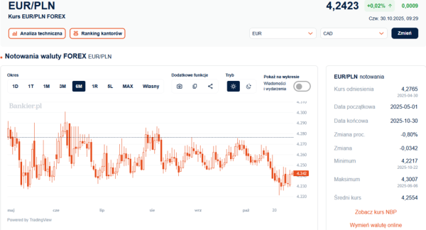 W rezultacie w środę kurs euro wobeczłotego wzrósł o jeden grosz, a w czwartek rano wspólna walutazostała wyceniona na 4,2443 zł. Oznacza to zachowanie kursu EUR/PLNw ramach trwającej od kwietnia tendencji bocznej o zakresie 4,23-4,31 zł.Złotemu nie powiodły się ostatnie próby przebicia wsparcia na poziomie 4,2250zł.