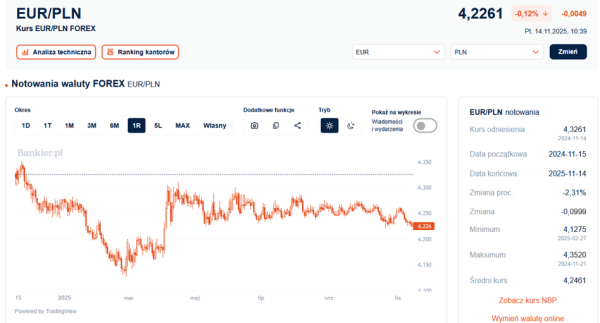 O 10:39 kurs euro kształtował się na poziomie 4,2261 zł, zniżkując o niemalże pół grosza w porównaniu do czwartkowego zamknięcia. Tym samym kurs EUR/PLN testuje strefę wsparcia (4,2250 zł), wyznaczającą dolną granicę trwającej od kwietnia konsolidacji.