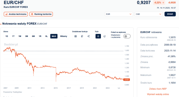 Należy także zwrócić uwagę na siłę franka szwajcarskiego. Kurs EUR/CHF w piątek rano ustanowił historyczne minimum na poziomie 0,9185, delikatnie pogłębiając poprzednie historyczne minima z kwietnia i października 2025 roku. W konsekwencji, mimo umacniającego się złotego na polskim rynku, frank podrożał o niemalże grosz, osiągając cenę 4,5895 zł. Niemniej jednak kurs CHF/PLN nadal mieści się w obowiązującym od kwietnia trendzie bocznym o zakresie 4,50-4,60 zł.
