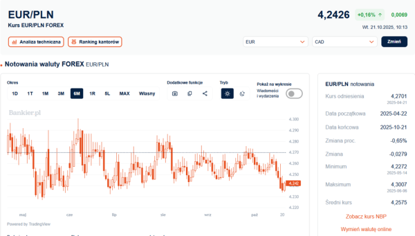 We wtorkowy poranek euro wyceniano już zaledwie na 4,2344 zł,atakując najniższe pułapy od kresu czerwca. Lecz już o 10:13 kurs europejskiejskurczyzny podniósł się do 4,2426 zł. Ciągle jednak możliwy jest szturm na linię 4,2250 złdefiniującą minimalne ograniczenie utrzymującego się od kwietnia trendu bocznego.