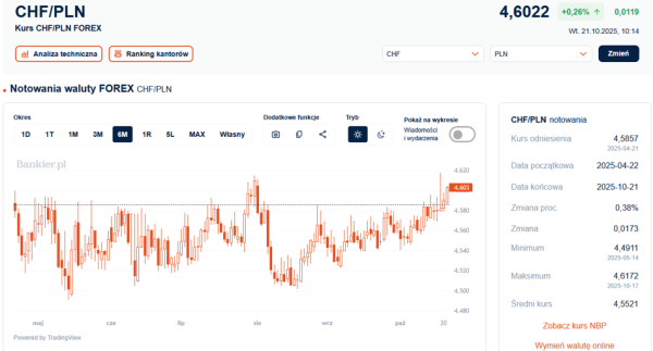 Frank szwajcarskibył notowany po 4,6047 zł, innymi słowy o 1,4 grosza wyżej niż dzień wcześniej. Oznaczato próbę opuszczenia górą trwającego od kwietnia trendu bocznego w strefie4,50-4,60 zł. Potencjalne potwierdzenie tego ruchu na podstawie analizytechnicznej zwiastowałoby wzrost kursu CHF/PLN w pobliże 4,70 zł. Siła helweckiejwaluty dostrzegalna jest przede wszystkim na parze z euro, gdzie kurs EUR/CHF był dzisiaj notowany najniżejw dziejach.
