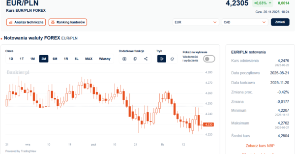 W czwartek o godzinie 10:24 euro wyceniano na 4,2305 zł. Jednak w godzinach porannych – jeszcze przy niezbyt dużej aktywności na rynku – kurs EUR/PLN spadł do poziomu 4,2256 zł, po raz trzeci w tym tygodniu sprawdzając dolną barierę tegorocznego trendu horyzontalnego.
