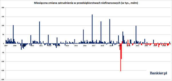 Pomijając styczniowe „skoki” statystyk zatrudnienia (wynikające z corocznej zmiany próby badanych przedsiębiorstw), zatrudnienie w sektorze przedsiębiorstw zmniejszało się niemal nieprzerwanie od początku 2023 roku. Natomiast w 2025 roku ubyło łącznie 43,4 tys. etatów.