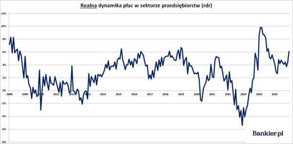 Przyspieszenie nominalnej stopy progresji wynagrodzeń w obliczu kurczącej się inflacji CPI sprawiło, że faktyczny wzrost płac poszybował w górę. Przy grudniowej inflacji CPI ostatecznie oszacowanej przez GUS na 2,4% realna dynamika płac w sektorze przedsiębiorstw wyniosła aż 6,09% rdr. Był to najwyższy rezultat od sierpnia 2024 roku. Dla porównania, przez cały miniony rok wartość ta utrzymywała się w przedziale 2,65-4,85%, co jak na historyczne standardy wcale nie było rezultatem niskim.