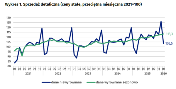 Po usunięciu wpływu czynników o charakterze sezonowym,w styczniu 2026 r. sprzedaż detaliczna w cenach stałych była o 5,1% wyższaniż w analogicznym miesiącu poprzedniego roku, a także wzrosła o 0,5%względem grudnia. Zatem wynik po uwzględnieniu korekty sezonowej był jeszcze korzystniejszy od wzrostu o4,7% rdr odnotowanych w grudniu.