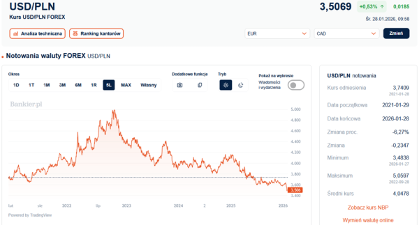 W środę rano kurs USD/PLN co prawda podniósł się do 3,5007 zł, jednak dynamiczne przebicie w dół wielomiesięcznego trendu bocznego stało się faktem i w oparciu o analizę techniczną, sugeruje to dalszą deprecjację „zielonego”. Obecnie najbliższym celem jest poziom 3,40 zł, a kolejnym wieloletnie minima ze stycznia 2018 roku, znajdujące się na poziomie 3,30 zł.