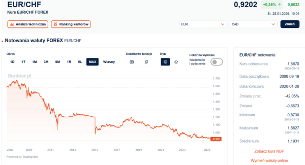 We wtorkowy wieczór kurs EUR/CHF spadł w okolice 0,9150 franka za jedno euro. Nigdy wcześniej wspólna waluta nie była tak tania w stosunku do CHF. Podobnie sytuacja wygląda w przypadku jednej z najstarszych par walutowych świata, czyli kursu USD/CHF. Ten poprzedniej nocy spadł nawet poniżej 0,76 franka za jednego dolara i ustanowił najniższy poziom w historii, pomijając krótkotrwałe zamieszanie z sierpnia 2011 roku – tuż przed „zamrożeniem” kursu franka w relacji do euro.