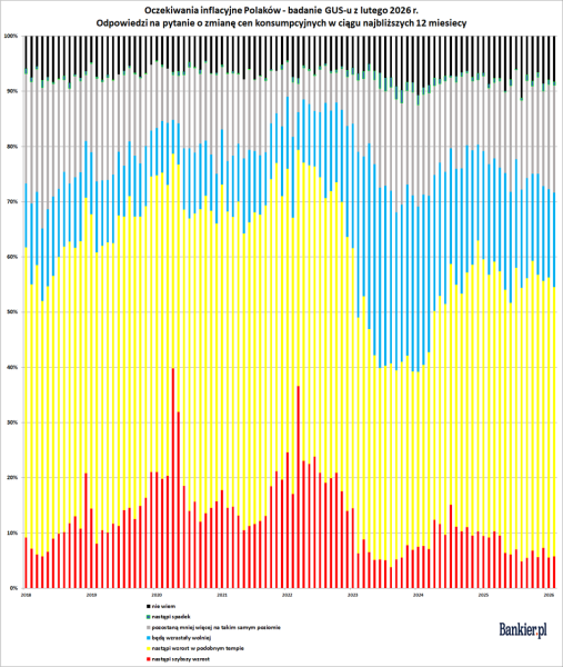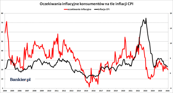 Jednocześnie w analizach GUS od roku obserwujemy słabnącąbojaźń przed inflacją. Indeks prognoz inflacyjnych GUS-u w lutym 2026roku zredukował się z 20,6 pkt. do 19,8 pkt. i był to drugi niski odczyt polutym 2024 roku. Wskaźnik ten jest obecnie zgodny z wartościami inflacjikonsumenckiej rzędu 2-3% – czyli generalnie rzecz biorąc pułapu inflacyjnegoNarodowego Banku Polskiego.