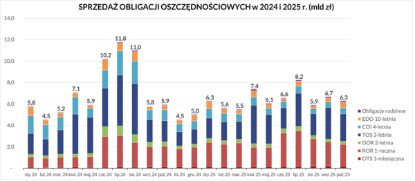 W miesiącu październiku 2025 roku Ministerstwo Finansów zbyło obligacje skarbowe dla klientów indywidualnych za niemal 6,3 mld złotych. To rezultat o 5,7% mniejszy niż we wrześniu, ale jednocześnie o 6,1% większy niż w październiku roku 2024. Jest to wciąż mocny wynik, biorąc pod uwagę sukcesywnie obniżające się oprocentowanie tych papierów.