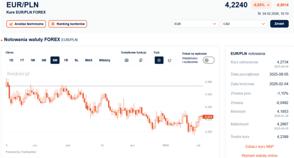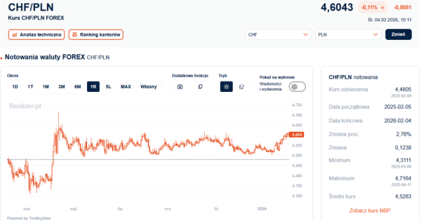 W środę rano za franka szwajcarskiegonależało zapłacić 4,6043 zł, natomiast we wtorek późnym wieczorem kurs CHF/PLN dochodził nawet do 4,6155zł i był najwyższy od połowy października. Obserwujemy więc próby przełamania zakresu4,60-4,62 zł, na którym to zatrzymywały się aspiracje do opuszczenia trendu bocznegoprzez minione 9 miesięcy. Bowiem generalnie od kwietnia 2025 kurs frankakrąży w przedziale 4,50-4,60 zł.