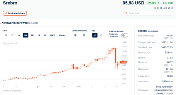 Jeszcze bardziej dynamiczne zmiany zaobserwowano na rynku kontraktów na srebro, które przed południem zyskały na wartości o blisko 12%, osiągając cenę 85,98 USD/oz. Dzień wcześniej kwotowania białego metalu początkowo spadły z 85 USD do 71,20 USD/oz., by w dalszej kolejności wzrosnąć do prawie 80 USD. Natomiast w piątek cena srebra zanotowała rekordowy spadek o 28%.
