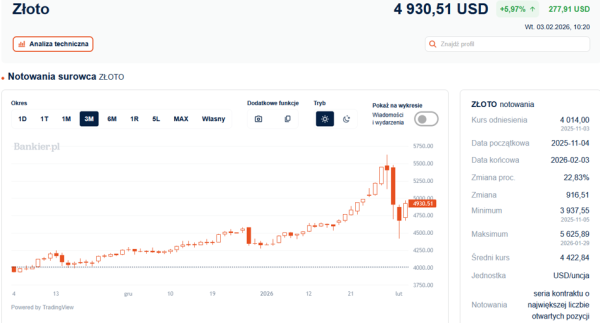 We wtorek o godzinie 10:20 najaktywniejsza seria nowojorskich kontraktów futures na złoto wzrosła o prawie 6%, osiągając poziom 4 930,51 USD za uncję. Według doniesień agencji Reuters, to najmocniejszy dzienny wzrost cen złota od listopada 2008 roku – to jest punktu kulminacyjnego kryzysu finansowego z lat 2007-09.