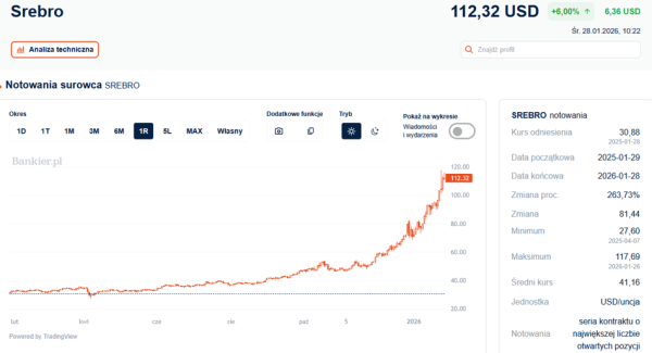 Jak zwykle jeszcze szybciej niż złoto drożeje srebro. Uncja białego metalu w środę rano rosła o 6,5%, osiągając cenę 112,82 USD/oz. Poprzedniego dnia biały metal podrożał o ponad 9% po bardzo zmiennej sesji piątkowej, kiedy to wyznaczył nominalny rekord wszech czasów na poziomie 117,69 USD/oz.
