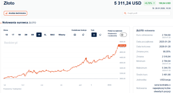 Nawet przy znaczącym wzroście wartości polskiego złotego względem dolara ceny złota w Polsce ustanawiają historyczne maksima. W środę rano uncja królewskiego metalu była wyceniana na blisko 18,5 tys. złotych polskich. To o 19% więcej niż z końcem 2025 roku i już o 66% więcej niż dwanaście miesięcy temu. Oczywiście po tej „giełdowej” cenie nie jesteśmy (i nigdy nie byliśmy) w stanie nabyć fizycznego złota. Uncjowa złota moneta inwestycyjna to w tej chwili wydatek co najmniej 19 tysięcy złoty. Dla porównania jeszcze we wrześniu 2024 roku w taką samą monetę dało się zaopatrzyć za mniej niż 10 000 zł.