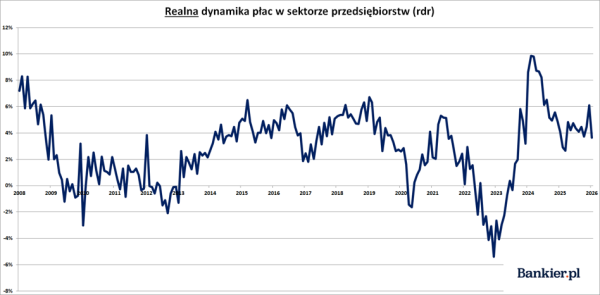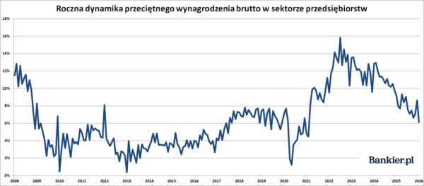 Styczniowe dane dotyczące płac w sektorze przedsiębiorstw wskazują na powrót do tendencji spadkowej rocznego tempa wzrostu nominalnego wynagrodzenia. Po zaskakującym wzroście w listopadzie i grudniu nie ma już śladu. Roczne tempo wzrostu płac malało od sierpnia 2022 roku i według większości ekonomistów taka tendencja ma się utrzymać również w 2026 roku. Chodzi o to, że dynamika płac ma iść w parze ze spadającą inflacją, która nie uzasadnia już tak sowitych podwyżek, jak w poprzednich latach.