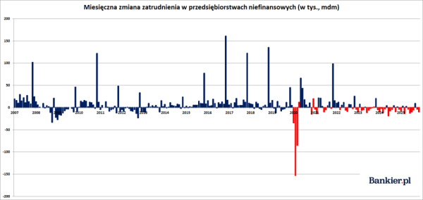 Dzisiejszy odczyt jest wręcz zadziwiający, ponieważ styczeń prawie zawsze przynosi miesięczny wzrost zatrudnienia w sektorze przedsiębiorstw. Zazwyczaj jest to wzrost bardzo znaczący, często przekraczający sto tysięcy etatów. Jest to jednak efekt czysto statystyczny, wynikający ze zmiany próby badanych przez GUS przedsiębiorstw. Z rejestru wypadają firmy upadające (one zwykle zwalniają pracowników), a włączane są firmy rozwijające się. Dlatego też tegoroczny styczniowy spadek zatrudnienia trudno uznać za dowód siły polskiego rynku pracy. To dopiero drugi styczniowy spadek zatrudnienia w historii tych statystyk. Poprzedni (w roku 2021) miał miejsce z powodu lockdownów.