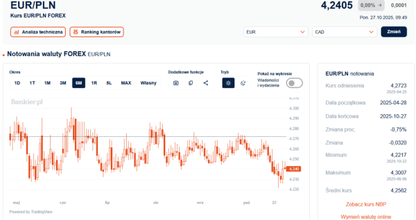 W poniedziałek o godzinie 9:40 kurs euro rósł co prawda tylko nieznacznie, ale mimo to sygnalizował obniżenie się wartości złotego w stosunku do wspólnej waluty. Euro wyceniane było na 4,2433 zł. W piątek kurs EUR/PLN wzrósł o jeden grosz po tym, jak w poprzednich dniach testował granicę 4,2250 zł. Czyli dolne ograniczenie obowiązującego od kwietnia trendu bocznego.