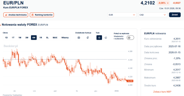 W czwartkowy ranek kurs euro prezentował się na poziomie 4,2102 zł i zasadniczo pozostawał niezmienny w porównaniu do środowego kursu referencyjnego. Co więcej, od początku roku 2026 kwotowania euro wciąż utrzymują się blisko poziomu 4,21 zł, oscylując w przedziale 4,21-4,22 zł.