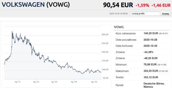 W III kwartale 2025 r. konglomerat z Wolfsburga poniósł stratę operacyjną na kwotę 1,3 mld euro w zestawieniu do profitu na poziomie 2,8 mld euro w analogicznym okresie poprzedniego roku. Analitycy prognozowali stratę w wysokości 1,7 mld euro.