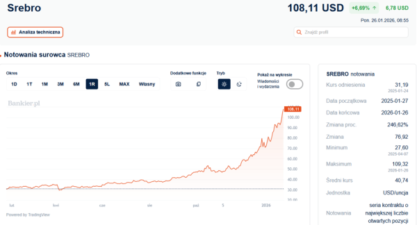 Trwa gorączka na rynku metali wartościowych. Notowania złota po raz pierwszy w dziejach przekroczyły granicę 5 000 dolarów za uncję. Srebro jest szacowane już na niemal 108 USD/oz. Oba kruszce drożeją w takim tempie, jakby niebawem epoka pieniądza fiducjarnego miała dobiec końca.
