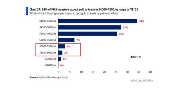 W ostatnim czasie na rynku pojawiło się kilka prognoz, które potwierdzają scenariusz braku większej korekty i utrzymania ceny przynajmniej powyżej 4000 dolarów do końca 2026 r. Tak przynajmniej wynika z Global Fund Manager Survey, czyli comiesięcznego badania nastrojów oraz alokacji inwestycyjnych globalnych menedżerów funduszami, przeprowadzanego przez Bank of America.