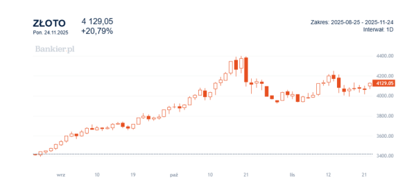 W ostatnich tygodniach grudniowa obniżka stóp znowu jest scenariuszem, który na rynku terminowym ma większe szanse realizacji, stąd realnie złoto na chwilę obecną sprawia wrażenie, jakby zakończyło korektę, po drodze pojawiając się powyżej 4200 dolarów, a w ostatnich dniach jest wyceniane stabilnie, powyżej 4100 dolarów za uncję trojańską. W listopadzie cena złota zyskała dotychczas około 1,6 proc. po wzroście o 3,7 proc. w październiku i 11,8 proc. we wrześniu. Od początku roku dolarowa stopa zwrotu na złocie wynosi 56 proc.