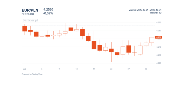Notowania EUR/PLN wzrosły w piątek przed południem, po godzinie 10:50 do poziomu 4,2533 zł i była to najwyższa wartość, jaką płacono za europejską walutę od 17 października, czyli od dokładnie dwóch tygodni. Bodziec do wzrostu wyceny euro dał wstępny odczyt wskaźnika inflacji za październik w Polsce, który pozostał poniżej 3 proc. i osiągnął poziom 2,8 proc. rdr., niższy od przewidywań analityków (2,9 proc.). W perspektywie miesięcznej zaskoczenie było jeszcze większe (0,1 proc. wobec prognozowanych 0,4 proc.). Taki układ danych wspiera naciski na RPP i prognozę kolejnych obniżek stóp procentowych. Następna decyzja już 5 listopada.
