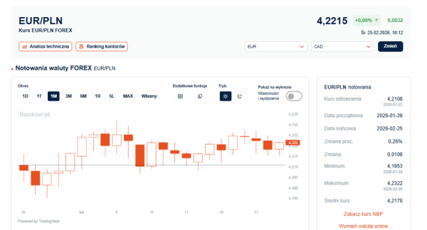 Notowania EUR/PLN osiągnęły po godzinie 9.40 w środę rano wartość 4,2215, wzrastając zaledwie o 0,08 proc. w porównaniu do wtorkowego zamknięcia. A zatem kurs euro znajdował się na zbliżonym poziomie co 24 godziny wcześniej, pomimo że w międzyczasie nastąpiło chwilowe wzmocnienie polskiej waluty oraz obniżenie kursu poniżej 4,216 zł. Zejście poniżej tego poziomu miało miejsce dwukrotnie w ciągu ostatnich godzin.