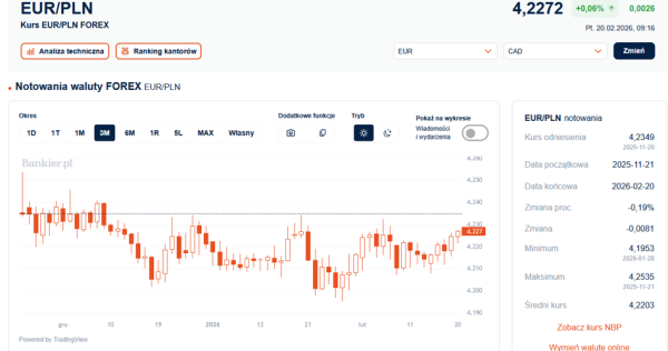 O godzinie 9:16 kurs euro wynosił 4,2271 zł, zyskując 0,25 grosza w porównaniu do czwartkowego kursu odniesienia. Niemniej jednak, para euro-złoty wciąż porusza się w lokalnym trendzie horyzontalnym, od początku roku oscylując w przedziale 4,1950-4,2350 zł.