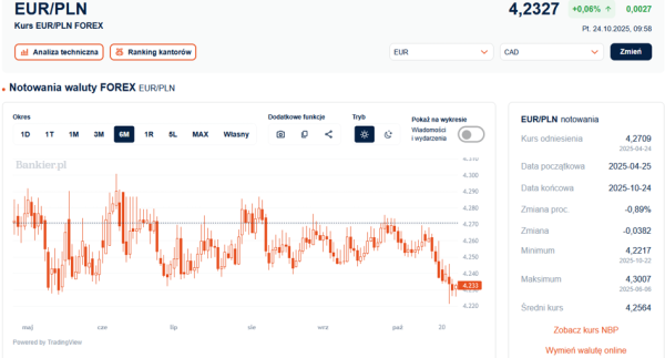 W piątek o godzinie 9:58 kurs euro kształtował się na poziomie 4,2327 zł i nie wykazywał istotnych zmian w stosunku do czwartkowego kursu odniesienia. W ciągu ostatnich dwóch dni kwotowania euro atakowały barierę 4,2250 zł, która wyznacza dolną granicę trendu bocznego trwającego od kwietnia.
