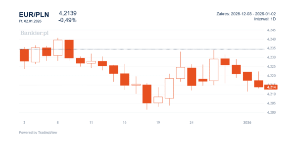 Notowania EUR/PLN tuż po godzinie 10:00 w piątek, 2 stycznia, plasowały się na poziomie 4,2139 zł, co oznaczało wzmocnienie się naszej waluty o przeszło 0,7 grosza w odniesieniu do zamknięcia w Sylwestra. W roku 2025 złoty umocnił się o 1,2% względem wspólnej waluty i był to trzeci rok z rzędu, w którym PLN zyskiwał w relacji do euro.
