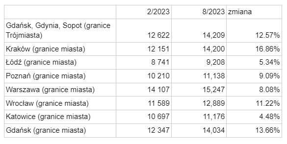 W porównaniu do poprzedniego miesiąca ceny na 7 największych rynkach wzrosły o 1-2%. Największe wzrosty miały miejsce w Trójmieście, ale i tam było to “zaledwie” 3%. Jeśli jednak spojrzymy już w perspektywie 6 miesięcy, a zatem na okres, w którym obietnica rządowych dopłat rozpaliła zainteresowanie, sytuacja wygląda już zupełnie inaczej.