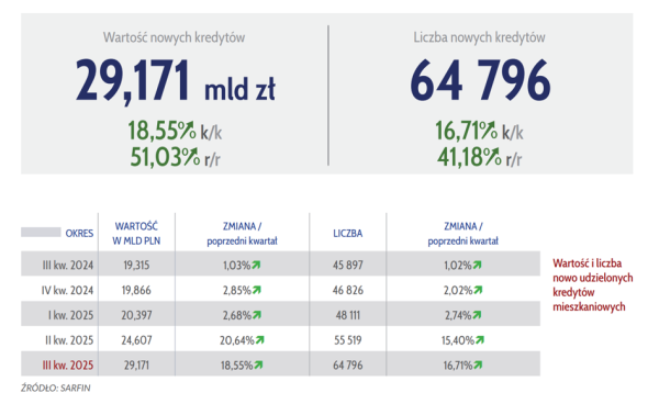 W kwestii wartościowej progresje są jeszcze bardziejwyraźne. Do kredytobiorców powędrowało w III kw. 2025 r. 29,1 mld złwsparcia finansowego. To o 18,5 proc. więcej niż w okresie od kwietnia do czerwca i aż o51,3 proc. więcej niż w III kw. 2024 r. Jest niemal pewne, iż 2025 r. okażesię najlepszym rokiem w historii rynku pod względem wielkości finansowania. Zostanieprzekroczona bariera 100 mld zł i rekord niepobity od czasu boomu hipotecznego z 2021r.
