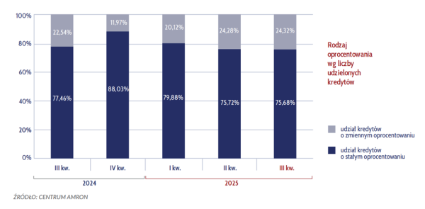 W raportach AMRON regularnie pokazywane są unikalne dane odnośnie strukturysprzedaży hipotek. Jednym z ciekawszych elementów nadal pozostaje rodzajoprocentowania wybierany przez nowych klientów. W III kw. 2025 r. w dalszym ciągupreważają kredyty z czasowo stałym oprocentowaniem.