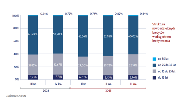 Dość małe zmiany zaszły dodatkowo odnośnie preferowanego okresu kredytowania. W 2025 r. stopniowo wzrastało zainteresowaniekredytami z okresem spłaty od 15 do 25 lat. Ich udział powiększył się z ok. 29 proc. dopowyżej 32 proc. sprzedaży. Zmniejszył się w tym czasie udział hipotek przyznawanychna dłuższe terminy, lecz w dalszym ciągu 60 proc. nowych umów zakłada spłatę w przedziale25-35 lat.