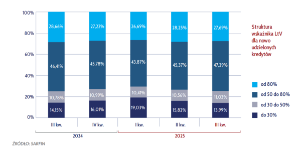 W strukturze świeżo przyznanych kredytów hipotecznych nie pojawiłysię znaczące zmiany odnośnie wskaźnika LTV. Procent umów z wkładem własnymponiżej 20 proc. jest niezmienny, bliski 27-28 proc.