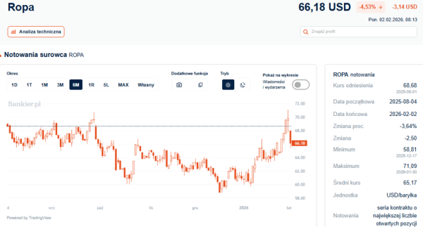Ropa staje się tańsza po weekendowych wypowiedziach Donalda Trumpa o negocjacjach z Iranem. Rynek zinterpretował to jako deeskalację i nie obawia się już tak bardzo nowej wojny na Bliskim Wschodzie.