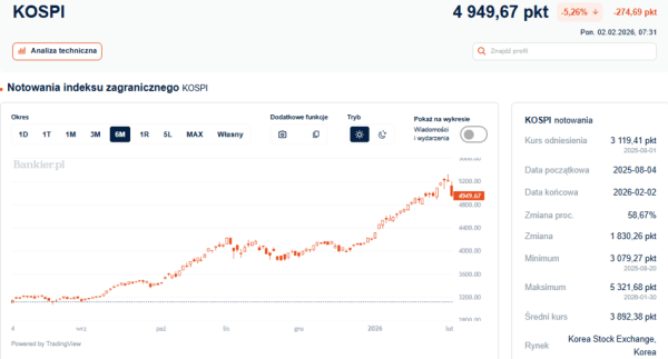na parkietach azjatyckich. Najszerszy wskaźnik akcji MSCI w regionie Azji i Pacyfiku z wyłączeniem Japonii (MIAPJ0000PUS), rozpoczął dzień handlowy od zniżki o 2,8%. Indeks giełdowy z Korei Południowej – KOSPI – w pewnych momentach tracił 5,5%, co na krótki okres czasu wywołało wstrzymanie obrotu.