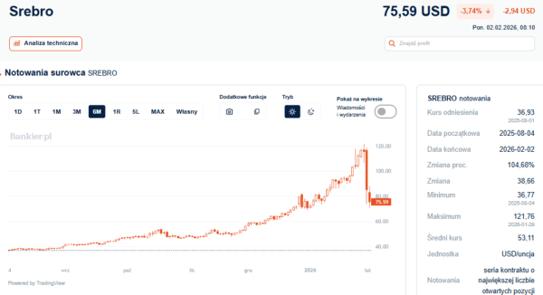 Ole Hansen, główny strateg rynku surowców w Saxo Banku, podkreślił, że o ile początkowym bodźcem do spadków sreba i złota była nominacja Kevina Warsha, która pomogła wygenerować odbicie dolara, o tyle głębokość wyprzedaży wynikała z kaskadowej sprzedaży kontraktów terminowych, kiedy inwestorzy usiłowali wyjść z pozycji w ETF-ach i opcjach.