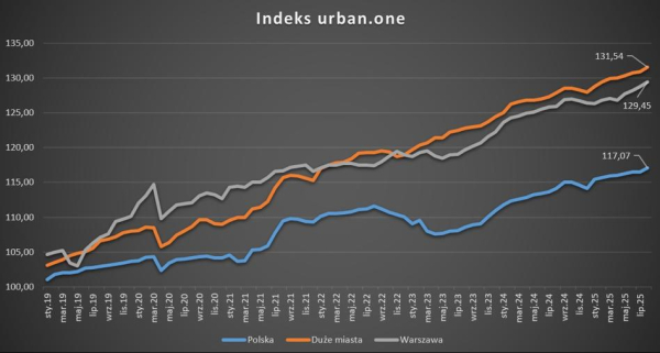 Analogiczna sytuacja miała miejsce w przypadku wskaźnika urban.one, który odzwierciedla stan na rynkach nieruchomości w Krakowie, Wrocławiu, Gdańsku, Gdyni, Poznaniu i Łodzi. W sierpniu wartość wskaźnika ustabilizowała się na poziomie 131,54 pkt, co zwiastowało wzrost w stosunku miesiąc do miesiąca o 0,62 pkt oraz rok do roku o 3,67.