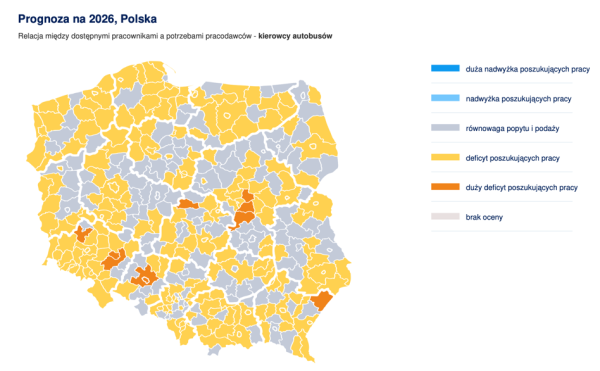 Zgodnie z danymi Ministerstwa Rodziny, Pracy i Polityki Społecznej, szoferzy autobusów i prowadzący tramwaje wciąż figurują w 2026 r. w grupie profesji deficytowych we wszystkich województwach. Głównym powodem są wymagające uwarunkowania pracy – system zmianowy, odpowiedzialność oraz napięcie.