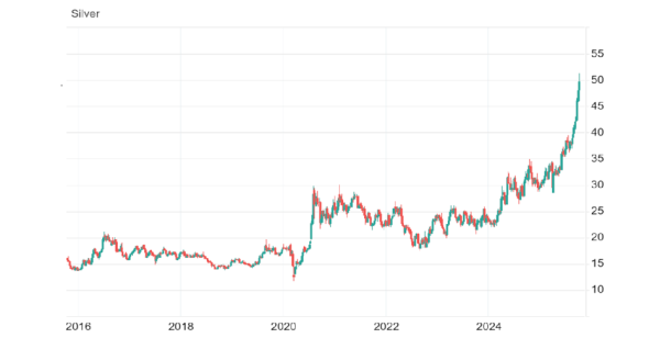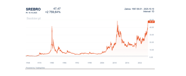 Wycena srebra w bieżących transakcjach osiągnęła w czwartek 9 października 2025 roku historycznie najwyższą wartość 51,24 dolarów za uncję trojańską, przekraczając pułap 50 dolarów po raz pierwszy od 1980 roku. Cena srebra w transakcjach natychmiastowych (spot) wzrosła w skali dnia o 4,8 proc. i mogła się poszczycić ponad 75-procentowym wzrostem ceny od początku roku. To nawet więcej niż zyskujące ponad 53 proc. od początku roku złoto.