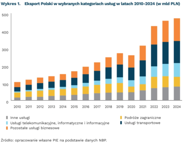 W roku 2024 spadła z kolei o 1% rok do roku wartość eksportu usług transportowych i po raz pierwszy od roku 2010 usługi transportowe nie były najliczniejszą kategorią eksportu usług z Polski – miały 27% partycypacji. W ocenie Instytutu na taką sytuację oddziałuje spowolnienie gospodarcze w Niemczech, zniżka konkurencyjności cenowej wywołana przez powiększające się koszty pracy i deficyt pracowników w sektorze przewozowym w Polsce. Największą partycypację w eksporcie mają z kolei pozostałe usługi biznesowe – 28 proc. w 2024 r., a usługi telekomunikacyjne, informatyczne i informacyjne – 17 proc. Wzrost tej kategorii w odniesieniu rocznym wyniósł 11% – zwrócono na to uwagę w publikacji.