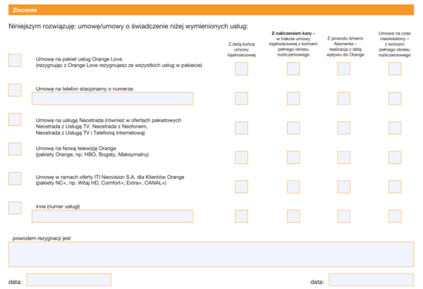 Druga część pisma, dotyczącego rezygnacji z umowy Orange, ma postać krótkiej ankiety. Należy w niej zaznaczyć odpowiednią usługę, z której klient rezygnuje. W sąsiedniej kolumnie dostępne są do wyboru opcje określające moment, w którym następuje wypowiedzenie umowy. Poniżej dostępne jest pole, w które klient może wpisać powód rezygnacji. Na dolnej części wniosku wymagany jest własnoręczny podpis oraz data.